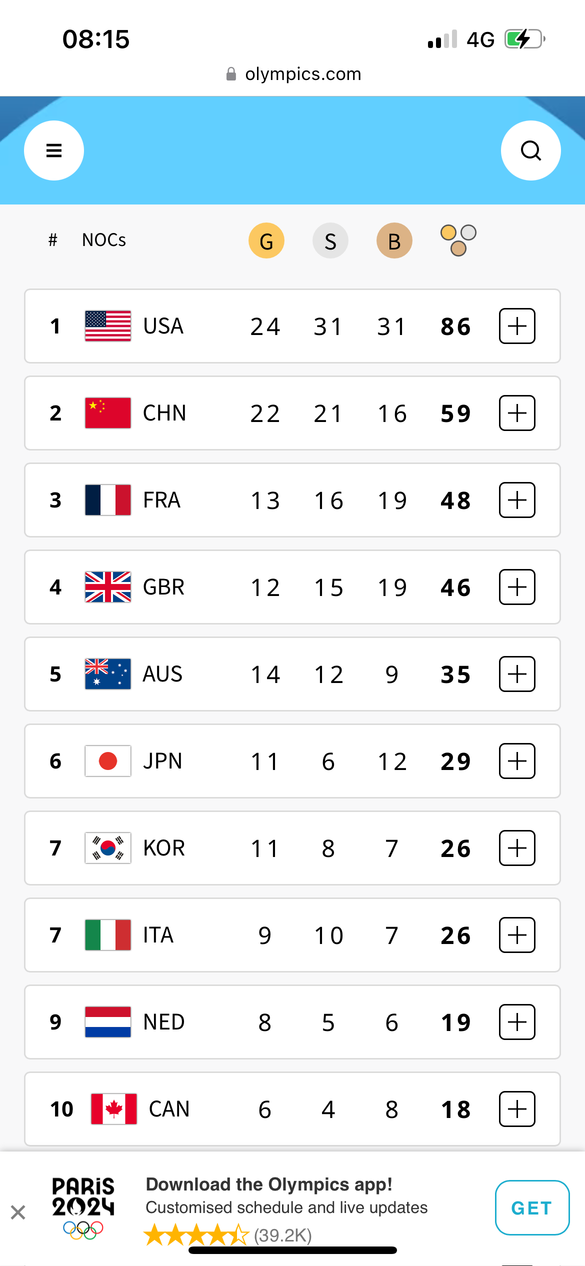 Κακός τρόπος να παρουσίασει κανείς την κατάταξη των χωρών με βάση των αριθμών μεταλίων. Βρες μια λίστα μετάλια per capita να δούμε τι γίνεται, γιατί από ότι φαίνεται η Αυστραλία πάει γαμιώντας.Άνετα στην κορυφή των μεταλλίων οι ΗΠΑ με 86 μετάλλια στο σύνολο. Η Ελλάδα μετά την κατάκτηση του Χρυσού μεταλλίου από τον Μιλτο ανέβηκε στην 17η θέση με 7 μετάλλια στο σύνολο.