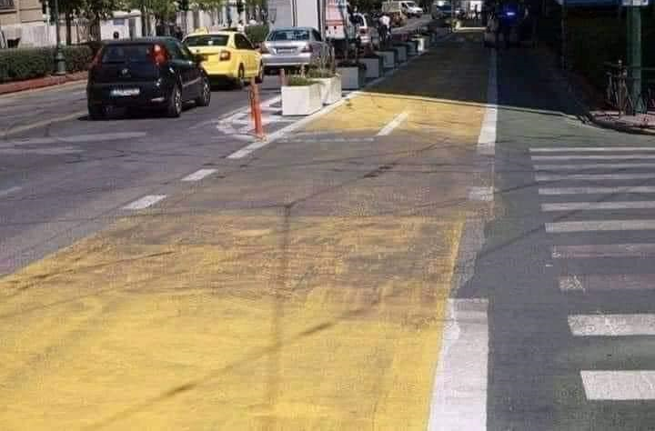 Ούτε καν έκλεισαν τα μπαλώματα. Έβαψαν τον δρόμο κίτρινο και το βάφτισαν ποδηλατόδρομο.