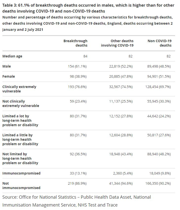 - Το 61% των breakthrough deaths είναι άνδρες. Αυτό φαίνεται να δείχνει πως το γεγονός να είσαι άνδρας είναι από μόνο του παράγοντας κινδύνου. Παράλληλα, είναι ελάχιστες οι μελέτες που να δείχνουν διαφορές στην πανδημική συμπεριφορά ανάλογα με το φύλο, π.χ. compliance με μάσκες, εμβολιασμός κτλ. Στην πράξη βέβαια δεν υπάρχει διαφοροποίηση στα μέτρα ανάλογα με το φύλο.