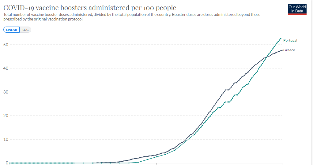 Για ένα διάστημα είχαμε παρουσιάσει τέτοια αυξητική τάση στις ενισχυτικές, που την είχαμε ξεπεράσειΚαλά, η Πορτογαλία είναι λογικό να μας έχει περάσει σε boosters. Είναι η χώρα με τους περισσότερους εμβολιασμούς ανά εκατομμύριο στην Ευρώπη.