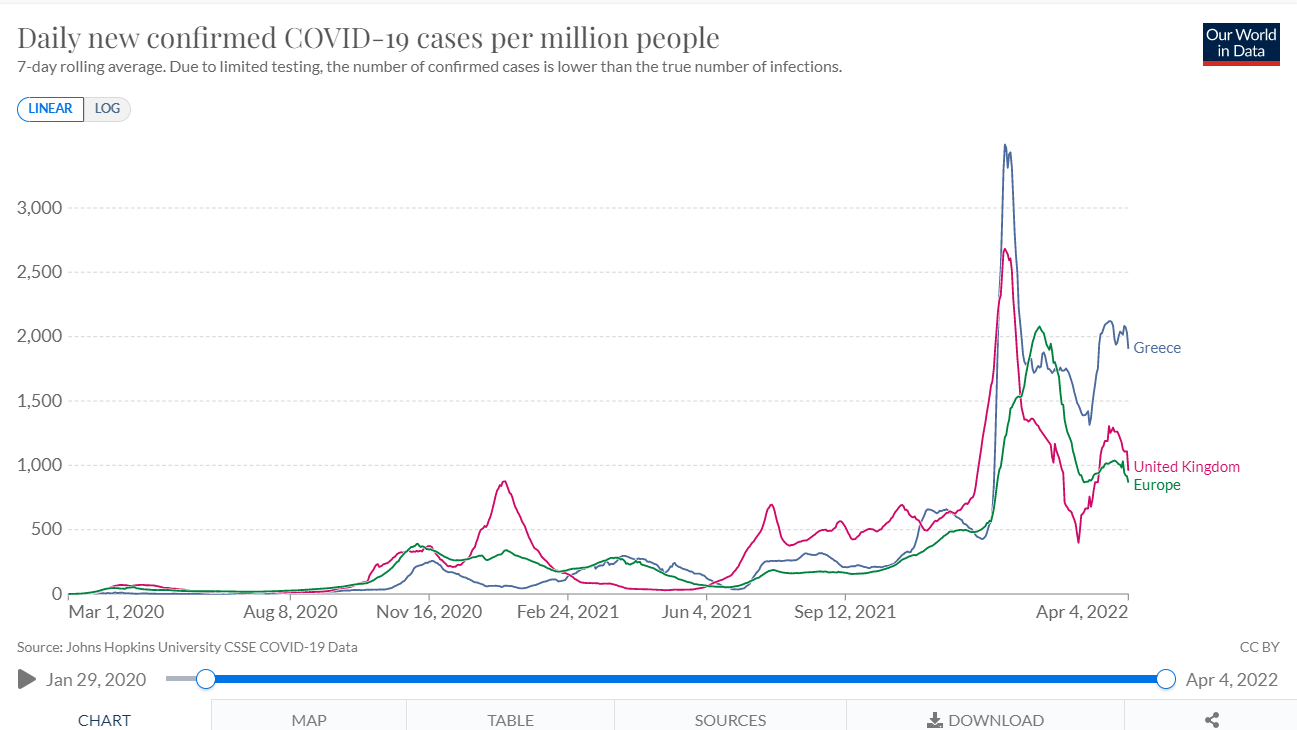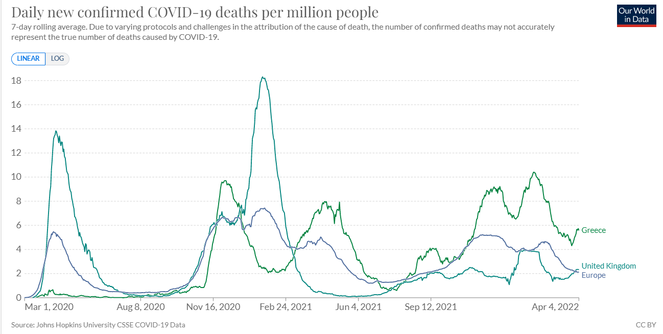 Οι θάνατοι ανα εκατομμύριο που έχουν είναι χαμηλότεροι από αυτούς που είχαν στα κύματα του 2020 και του 2021 και βρίσκονται εκεί που βρίσκεται και η υπόλοιπη Ευρώπη.