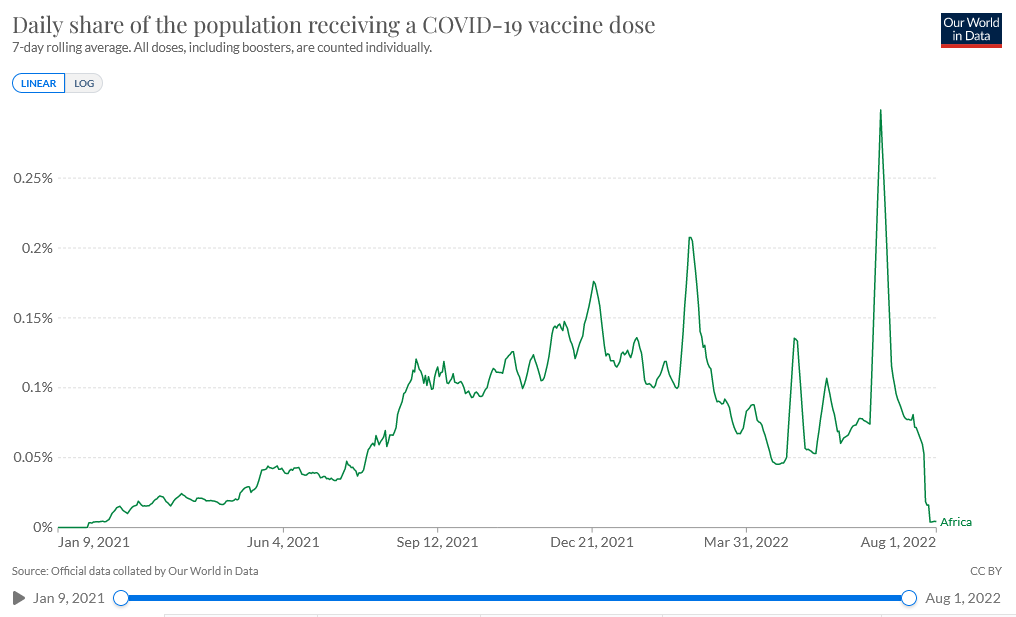 Οι χώρες της Αφρικής συνεχίζουν να έχουν σημαντικό ζήτημα με τη μαζική χορήγηση των εμβολίων στους πληθυσμούς τους, γεγονός που θα έπρεπε να μας απασχολεί στον Δυτικό κόσμο τα μάλα, λόγω των νέων παραλλαγών-στελεχών που εκκολάπτονται εκεί