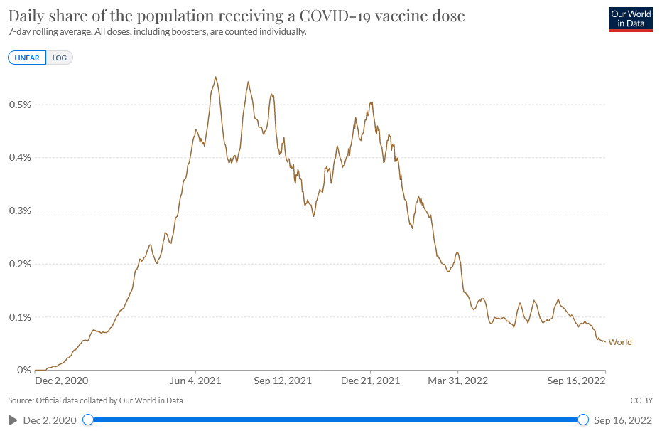 Διεθνώς, όμως βλέπουμε μια μειωμένη τάση του ημερήσιου εμβολιαστικού ρυθμού προσέλευσης, κάτι που ίσως οφείλεται τόσο στις απανωτές θερινές μολύνσεις, όσο και στην άρση των περιορισμών σε ανεμβολίαστους, όσο ίσως και στον λεγόμενο <<φυσικό>> εμβολιασμό που πραγματοποιούν πολλοί πια λόγω νόσησης