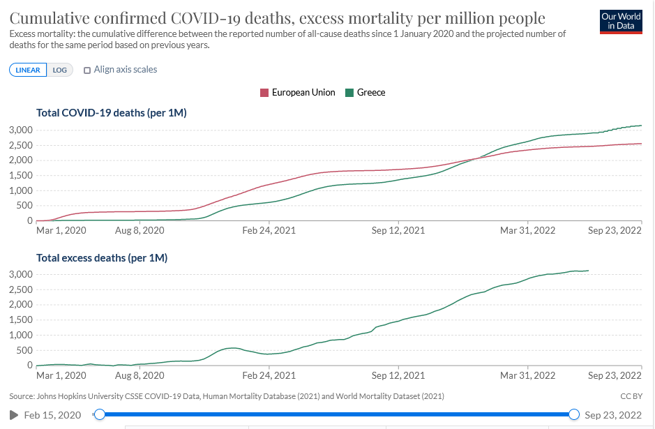 Ενδεχομένως, να έπαιξε ρόλο και ο ιδιαίτερος δικός μας τρόπος καταγραφής των θανάτων μέχρι το καλοκαίρι φέτος, όπου ουσιαστικά καταγράφονταν θάνατοι με κόβιντ και όχι από, κάτι που έπαιξε ίσως ρόλο σημαντικά στην αύξηση της θνησιμότητας από την Όμικρον και μετά