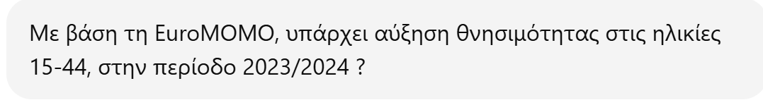 Με βάση την μελέτη του EuroMOMO για την περίοδο εβδομάδες 48 του 2023 ως 6 του 2024 (δηλαδή χειμώνας 2023/24), ναι — υπάρχει μικρή αλλά στατιστικά σημαντική υπερβολική θνησιμότητα (excess mortality) στην ηλικιακή ομάδα 15‑44 ετών.
