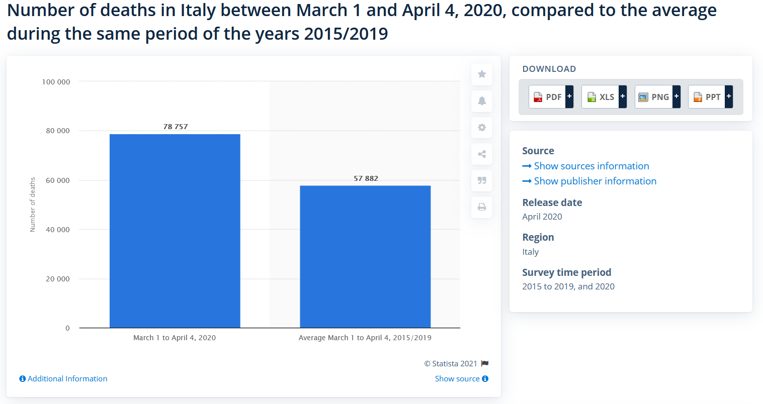 +35.8 % αύξηση στους θανάτους το δίμηνο του κορονοϊού είδε η Ιταλία πέρσι, σε σχέση με το μο των προηγούμενων 5 χρόνων. Με τέτοια νούμερα, όχι έξοδο με μάσκα και sms ή click away, σφράγισμα τα σπίτια με σανίδες, τύπου Κίνας, και εφοδιασμό με καλάθι από τα μπαλκόνια πρέπει να κάνουμε...