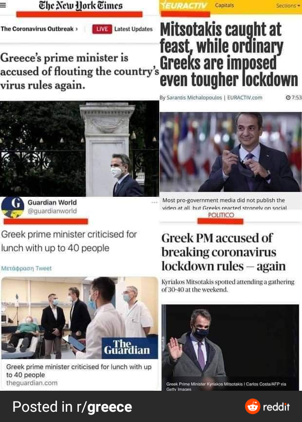Προφανώς το δεύτερο θα πεις και προφανώς καλά θα κάνεις και θα το πεις. Όταν λοιπόν αντικρίζεις τον Πρωθυπουργό της χώρας, ο οποίος επαναλαμβάνω, με αποφάσεις που στην πλειοψηφία τους, έπρεπε να τις πάρει και ορθώς τις πήρε, σου έχει απαγορεύσει τα πάντα και σε παροτρύνει να πειθαρχείς ή σε τιμωρεί με τσουχτερά πρόστιμα όταν δεν το κάνεις, πως είναι δυνατόν να μην σε ενοχλεί, όταν γλεντοκοπά και τρώει με δεκάδες ανθρώπους, χωρίς ίχνος προστασίας, σε δημόσια θέα. Πως δεν αντιλαμβάνεσαι, ότι αν κάνει κάτι τέτοιο σε δημόσια θέα, όταν σε γράφει τόσο προκλητικά και επιδεικτικά μπροστά στα μούτρα σου, τότε ποιος ξέρει τι κάνει πίσω από τις κλειστές πόρτες;