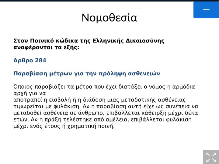 Το άρθρο αυτό έχει καταργηθεί (είναι του Παλαιού Ποινικού Κώδικα). Ο νέος Ποινικός κώδικας (Νόμος 4619/2019 - ΦΕΚ 95/Α/11-6-2019), στο άρθρο 285 αναφέρει:Αν εφαρμοζοταν αυτο ο νομος θα ειμασταν κομπλε σαν την κινα τωρα ,free of covid