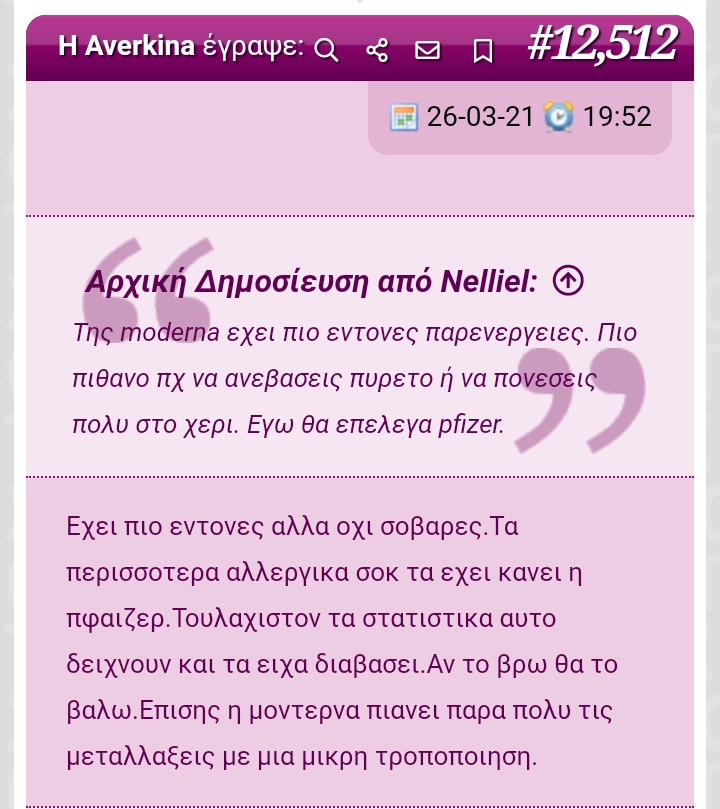 Δεν θα λεμε παλι τα ιδια,Και ουτε εχω καμια σκασιλα για τη γνωμη σου,Ηθελα να εμβολιαστω με νεας τεχνολογιας, mrna,το πετυχα εννοειται κανονικα και νομιμα και με το δικαιωμα που μου εδωσε το ιδιο το κρατος,δεν εφαγα τη θεση κανενος,τελεια και παυλα.Ακομα και οτι ειναι πολυ πιο αποτελεσματικα,ειναι ΑΡΚΕΤΟΣ ΛΟΓΟΣ αν δεν σε πειραζει.Αλλα κρατη κανουν αστρα σε πολυ μεγαλυτερες ηλικιες και δεν κανουν κατω απο 60 και αυτο λεει πολλα.Δεν ηξερα να μην πατησω ΝΑΙ επειδη εσυ εχεις αντιθετη αποψη.