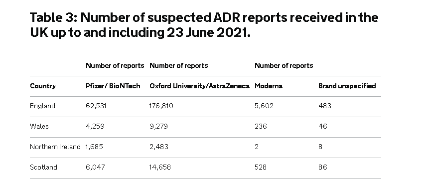 Σύμφωνα με τα επίσημα στοιχεία της Βρετανίας, μετά από τον εμβολιασμό παρατηρήθηκαν (ως 23 Ιουνίου):