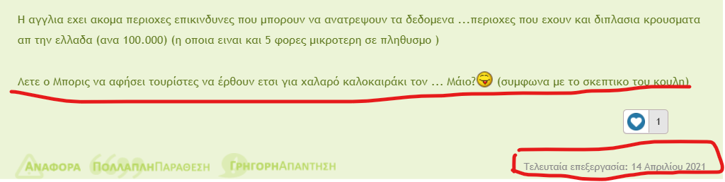 Αυτη ειναι απαντηση 5-6 μηνες πριν ....ερχεται συντομα μια μεγαλη πιτσα στην οικονομια .Αλλα τεσπα τι μας νοιαζει εμας ε @Paragontas7000 ?Δεν είμαστε κόκκινη λίστα και αυτό είναι το σημαντικό. Είμαστε Amber list όπως και οι περισσότερες χώρες. Απολύτως λογικό. Αν έχεις κάνει εμβόλιο τότε δεν ισχύει η καραντίνα οπότε αν πάω εγώ από Ελλάδα Αγγλία μπορώ κανονικά. Τέλος, τι μας νοιάζει αν είμαστε σε κάποια λίστα στην Αγγλία; Καημό έχουν οι Έλληνες να επισκεφτούν την Αγγλία;Δεν καταλαβαίνω γιατί το παίρνεις ως άξιο αναφοράς.