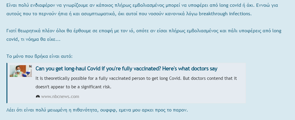 2)Μιας και ο @chester20080 μιλούσε συχνά για long covid .....τώρα που αποδείχθηκε επίσημα (γιατί το ξέραμε) ότι και οι εμβολιασμενοι κολλάνε ,θα φοβάστε πλέον απ' το long covid?