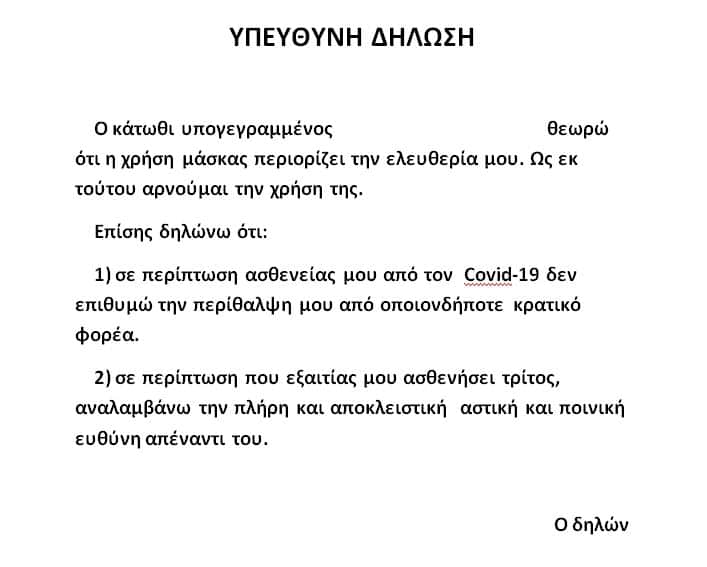 Όσοι δεν φορούν μασκα θα έπρεπε να υπογράφουν την δήλωση που ακολουθεί...