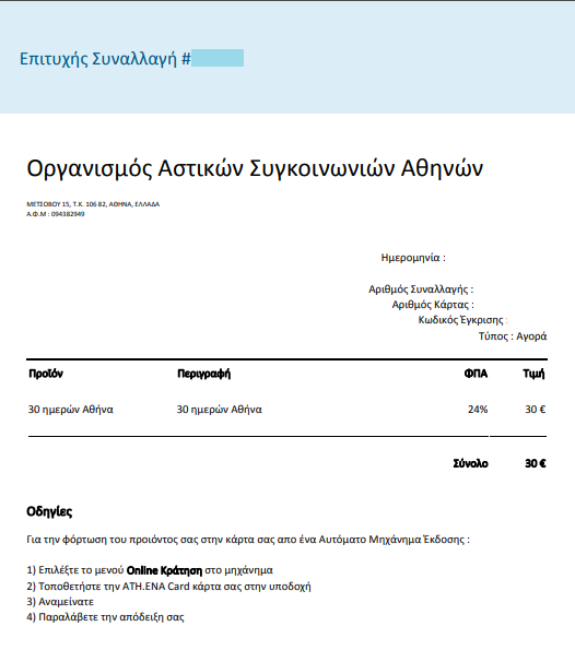 Έχεις δοκιμάσει να φορτώσεις το κόμιστρο μέσω android smartphone με NFC ή να πας σε άλλο αυτόματο πωλητή; Εφόσον τα έχεις δοκιμάσει όλα και ακολούθησες όπως πρέπει τα βήματα, αλλά το πρόβλημα παραμένει, τότε εκτύπωσε την απόδειξη πληρωμής από το προφίλ σου στο www.athenacard.gr (Αγορά / Τραπεζικό Σύστημα -> Αγορά -> Συναλλαγές. H απόδειξη είναι σαν κι αυτή που παραθέτω παρακάτω) και στη συνέχεια πήγαινε σε εκδοτήριο για να στο περάσουν εκείνοι.