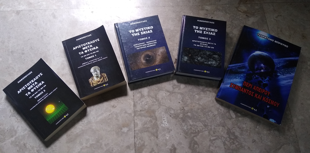 Ήταν και σκληρόδετα και σκέφτηκα να τους ρίξω μια ματιά. Κατάφερα να διαβάσω κάπως μόνο το "Περί Απείρου Σύμπαντος και Κόσμου" του Τζορνάνο Μπρούνο κι αυτό γιατί είναι "μετάφραση"-Λιακό. Προσπάθησα να διαβάσω λίγο το "Μετά τα Φυσικά" του Αριστοτέλη, γράφει το κείμενο και κάνει δικά του σχόλια! Τι καψιματιά ήταν αυτή, ανατινάζουν τον εγκέφαλο!