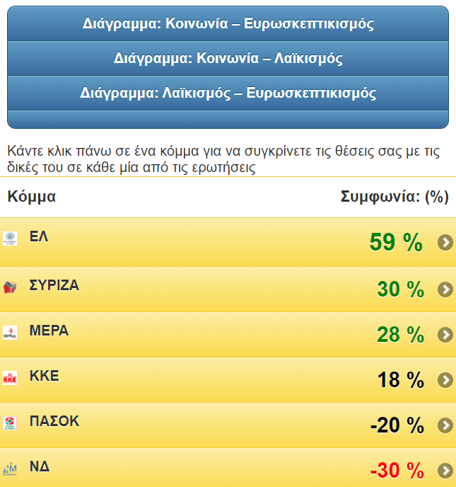 Σύμφωνα με την Πυξίδα Λαϊκισμού – Ευρωσκεπτικισμού είμαι πιο κοντά στο κόμμα: Ελληνική Λύση. Συμφωνία: 71%
