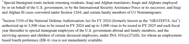 Oι special immigrants* όπως γράφει και η υποσημείωση αφόρα ειδικές περιπτώσεις, όπως άτομα από Αφγανιστάν, Ιράκ και οι οικογενειές τους. Στην ουσία είναι άνθρωποι από τις χώρες αυτές που δούλεψαν για τις ΗΠΑ κατά τις στρατιωτικές επιχειρήσεις που πραγματοποιήθηκαν εκεί, οπότε τους χορηγείτε visa πχ για προστασία απο αντίποινα, ειδικά τώρα που έχουν αποχωρίσει τα Αμερικανικά στρατεύματα.