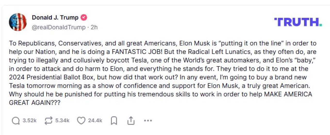 Ο πολέμιος των ηλεκτρικών αυτοκινήτων Trump θα αγοράσει Tesla για να στηρίξει τον Musk που του κάνουν μποικοτάζ και έμμεσα καλεί και τους υποστηρικτές του να κάνουν το ίδιο. What a time View attachment 146008