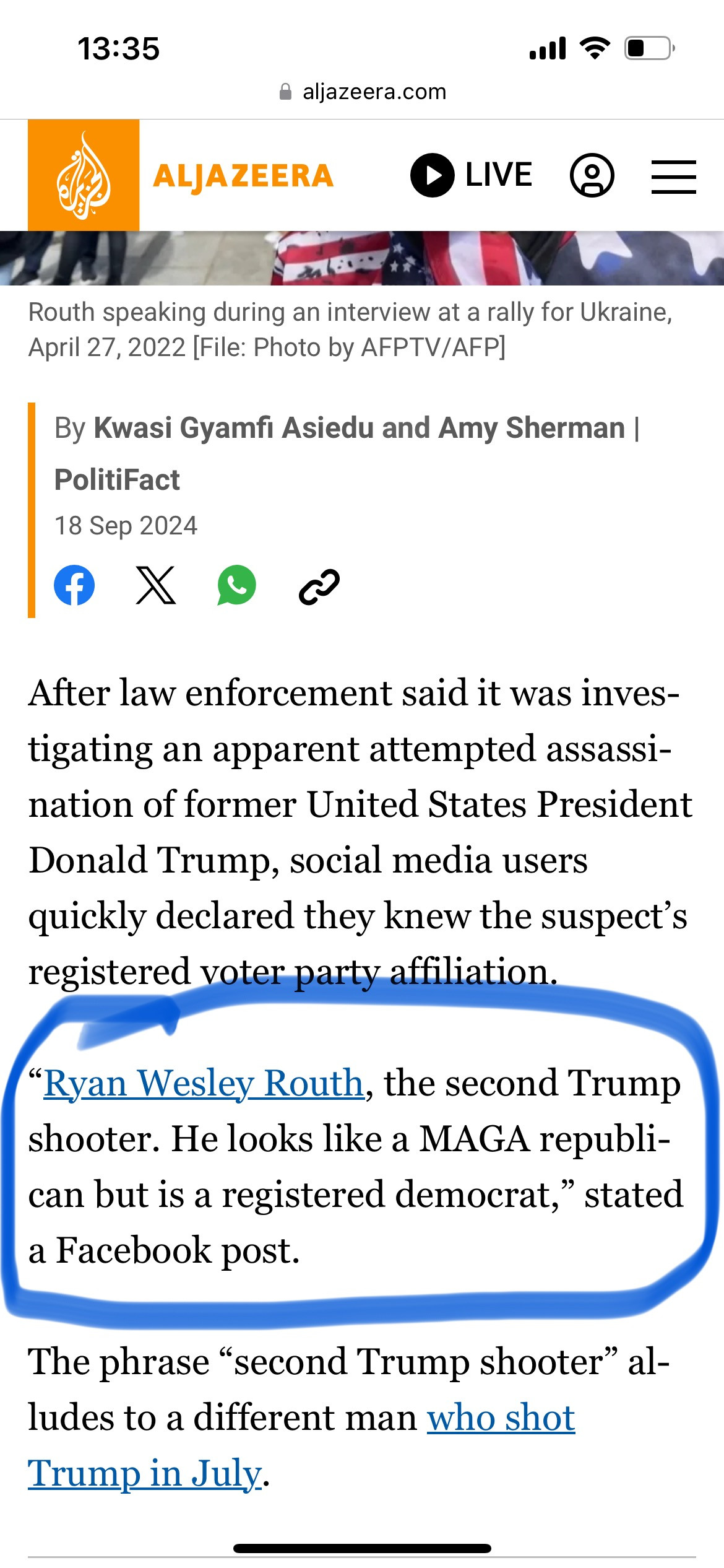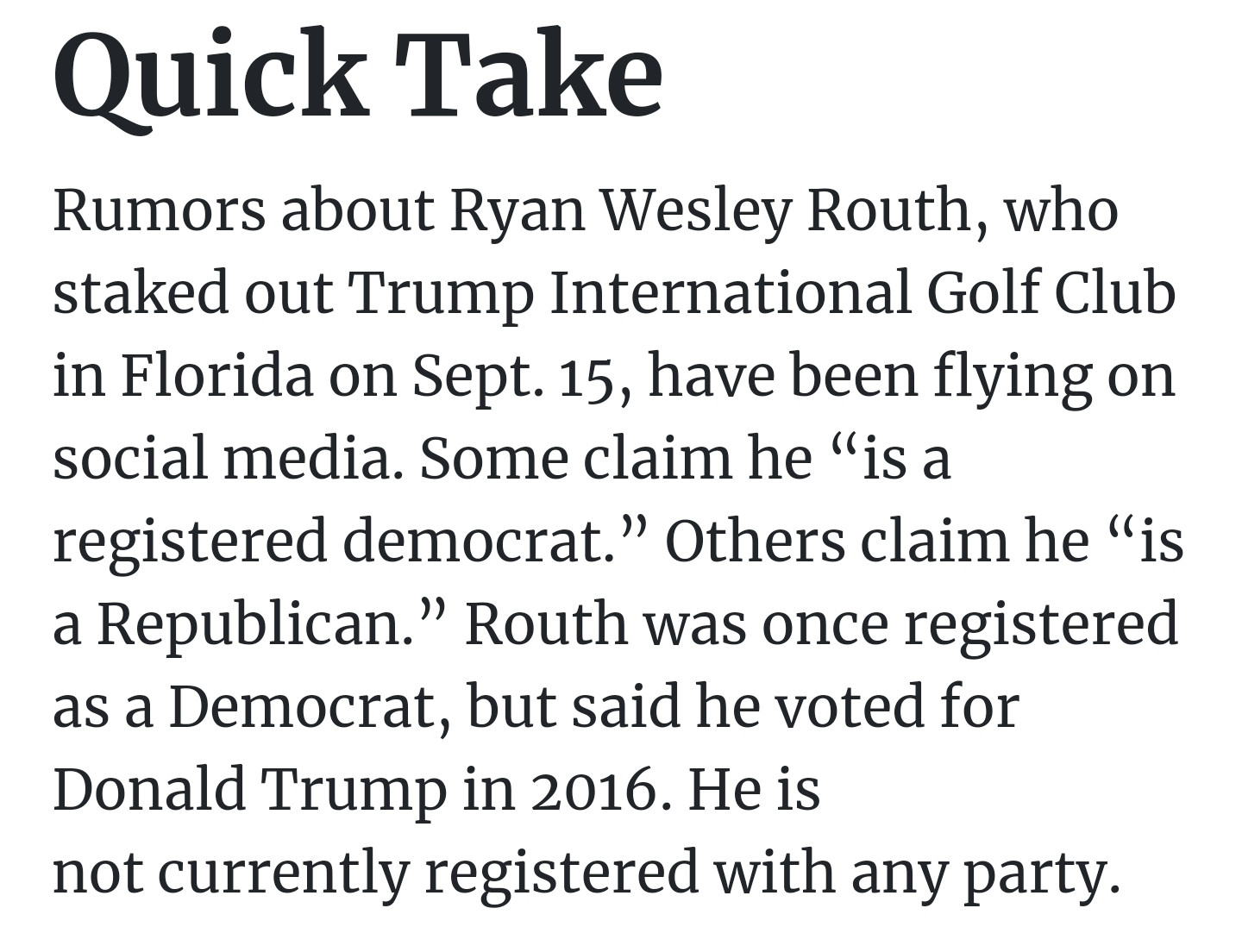 Rumors about Ryan Wesley Routh, who staked out Trump International Golf Club in Florida on Sept. 15, have been flying on social media. Some claim he "is a registered democrat." Others claim he "is a Republican." Routh was once registered as a Democrat, but said he voted for Donald Trump in 2016...www.factcheck.org