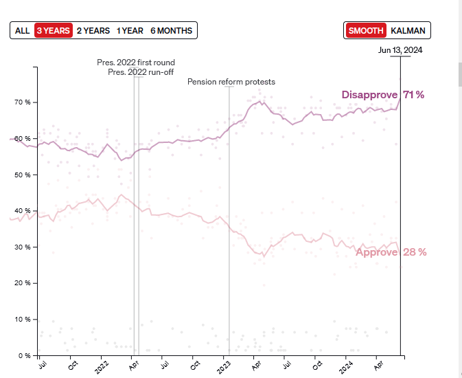 Το πιο τραγικό είναι το γεγονός ότι έχει approval ratio 28% όμως στις εκλογές θα πάρει max 20% γεγονός που δείχνει ότι δεν τον ψηφίζουν καν όλοι που έχουν θετική άποψη για εκείνον.