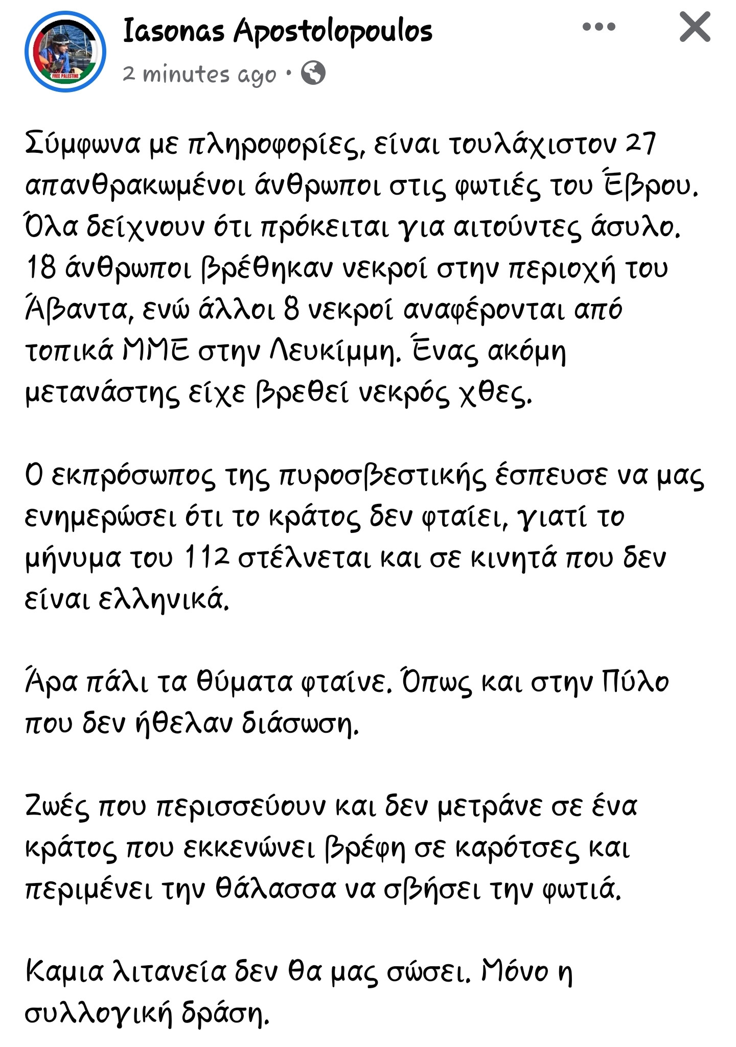 Δεν γίνεται δυστυχώς τίποτα. Και εγώ κακώς ασχολήθηκα με το όλο θέμα. Τον Νοέμβριο επρόκειτο να έχουμε εξελίξεις πάνω σε ένα ζήτημα μισανθρωπιάς. Θα περιμένω μέχρι τότε για να δω τους ανθρωπιστές μας τι στάση θα πάρουν.Γιάννη εδώ έπαθε σοκ το μισό forum επειδή είπαμε ότι υπάρχει πιθανότητα η φωτιά να άρχισε από τους μετανάστες (πχ να ήθελαν να ζεσταθούν και ο αέρας να εξάπλωσε την φωτιά) χωρίς να αναφέρουμε κάτι άλλο. Καλός η κακός η ανεξέλεγκτη μετανάστευση έχει αυτά τα αποτελέσματα, χάνονται δηλαδή ζωές επειδή προσπαθούν να μπουν μέσα στη χώρα χωρίς επίσημες οδηγίες και κατευθύνσεις.