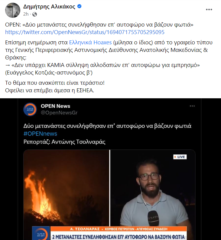 Ώπα τι έχουμε εδώ; Fake news τα περι εμπρησμων απο μεταναστες; ΑΠΟΚΛΕΙΕΤΑΙ! Μα.. αφου... το ειπε το OPEN.. τι οχι;;;
