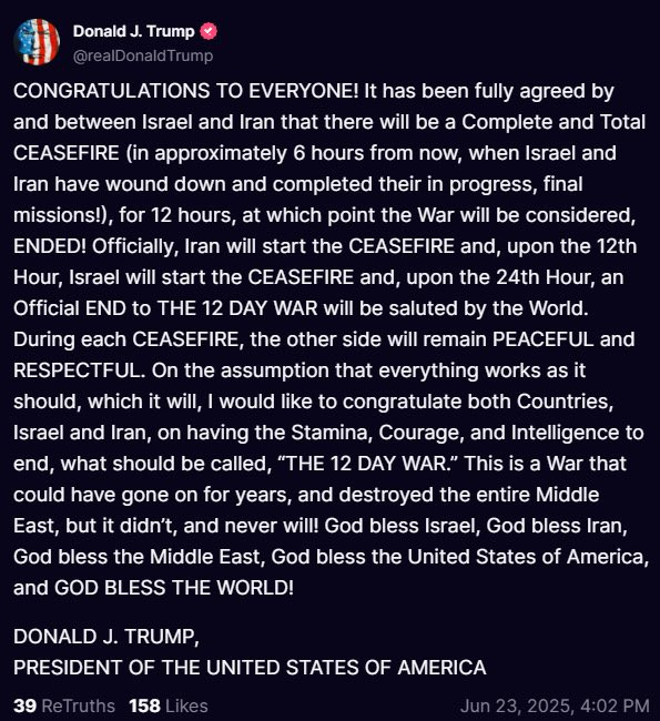 Ο πρόεδρος των ΗΠΑ, Ντόναλντ Τραμπ, δήλωσε το πρωί της Τρίτης ότι έχει «τεθεί πλέον σε ισχύ» η κατάπαυση του πυρός μεταξύ Ισραήλ και Ιράν, που θα τερματίσει τη 12ήμερη σύγκρουση των δύο χωρών. Από την πλευρά της, η ισραηλινή κυβέρνηση επιβεβαίωσε τη «διμερή εκεχειρία» και ανακοίνωσε πως «θα απαντήσει με σφοδρότητα σε οποιαδήποτε παραβίασή της».