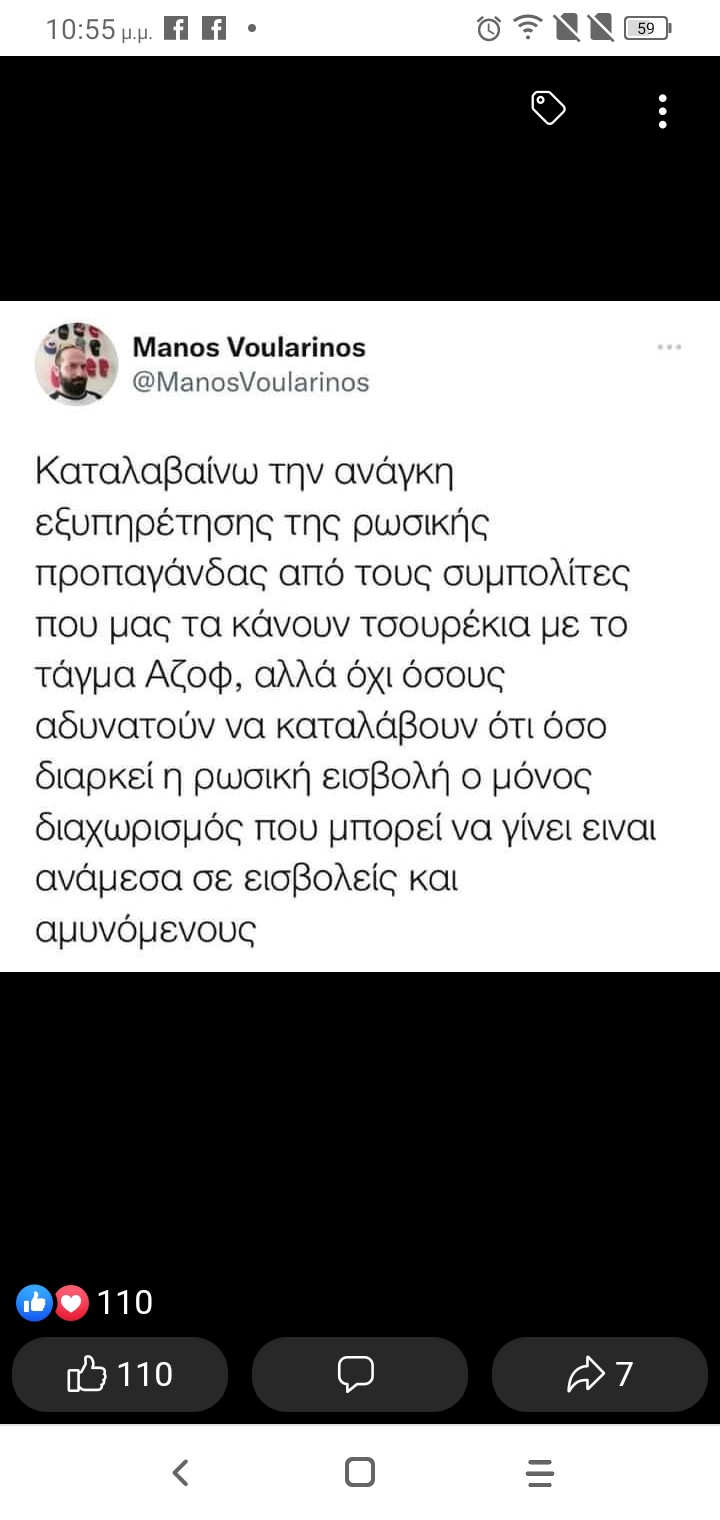 Το επόμενο βήμα υποθέτω είναι να πεις αυτά που έλεγαν το 2012 για την ΧΑ, ότι είναι έλληνες πατριώτες όχι ναζί.Αυτό είναι ρωσική προπαγάνδα. Το χειρότερο δεν είναι αυτό. Το χειρότερο είναι κάποιοι αριστεροί να θεωρούν πως η Λεπέν δεν είναι πρόβλημα να ανεβαινει στα γκαλοπ και παράλληλα να βάζουν ποσοστά δημοκρατικότητας σε αυτούς που αγωνίζονται εναντίον ενός εισβολέα κατακτητή και αναθεωρητη που έχει διαπράξει εγκλήματα πολεμου.