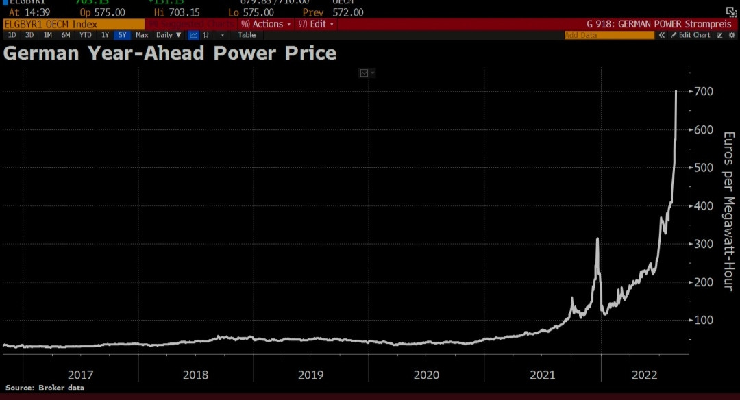 Ισχύει .....πριν 5 μέρες ήταν 500€/MWh ,σήμερα 700€/MWh στην Γερμανία .....στην Γερμανία!!!!!Δεν ξέρω τι είναι αυτό, αλλά δεν ισχύει. Το 200 ήταν για Ιούλιο, πλέον έχει πάει στα 300. 700€/MWh δεν παίζει, για κανένα λόγο.