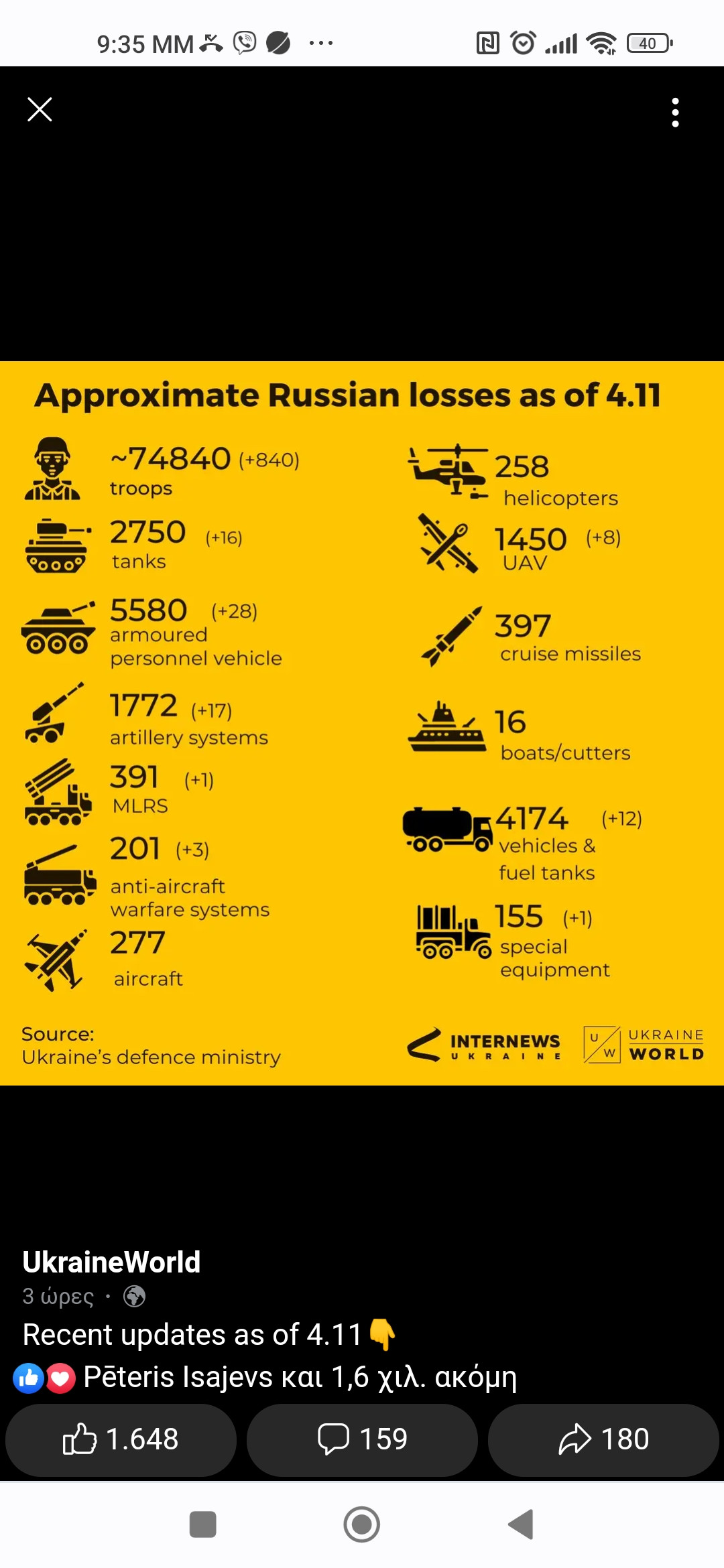 Τους Ουκρανούς πολίτες λυπάμαι. Οι απλοί άνθρωποι πληρώνουν με το αίμα τους τα συμφέροντα των Ολιγαρχών που υποστηρίζουν το χουντικό καθεστώς της Ουκρανίας ( με νεοναζιστικές βάσεις ). Που τους έσυραν σε έναν ηλίθιο πόλεμο με έναν αδελφό λαό για τα συμφέροντα της Δύσεως.