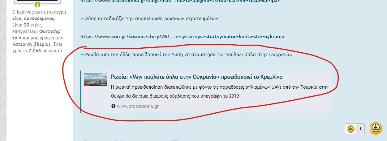 Ο Ιωάννης αυτή τη στιγμή είναι συνδεδεμένος. Είναι 24 ετών, επαγγέλλεται Ιστορικός και μας γράφει από Κατερίνη (Πιερία). Έχει γράψει 24.032 μηνύματα.