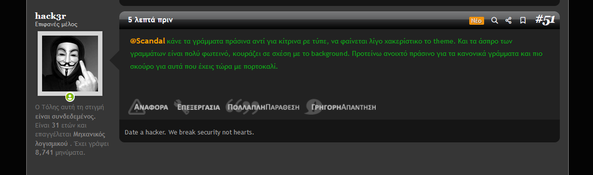 @Scandal κάνε τα γράμματα πράσινα αντί για κίτρινα ρε τύπε, να φαίνεται λίγο χακερίστικο το theme. Και τα άσπρο των γραμμάτων είναι πολύ φωτεινό, κουράζει σε σχέση με το background. Προτείνω ανοιχτό πράσινο για τα κανονικά γράμματα και πιο σκούρο για αυτά που έχεις τώρα με πορτοκαλί.
