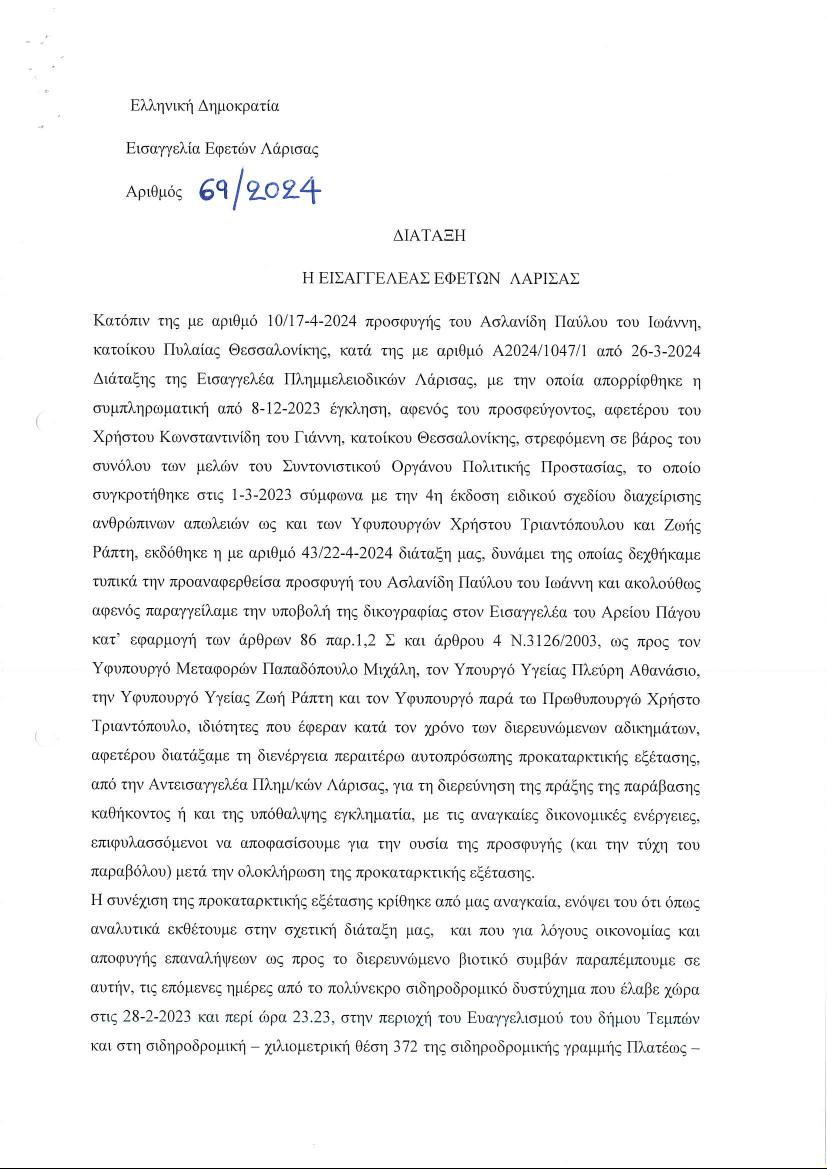 «Είναι βέβαιον ότι το υλικό που απομακρύνθηκε από τον τόπο του εγκλήματος ήταν εξαιρετικά σημαντικό για αποδεικτική αξιοποίηση, σε κάθε περίπτωση αποτελούσε τμήμα του αποδεικτικού υλικού, αφού περιείχε πειστήρια και ίχνη (προσωπικά αντικείμενα, γενετικό υλικό επιβατών που χάθηκαν κ.ο.κ.). Περαιτέρω, είναι προφανές ότι καμιά νόμιμη απόφαση δεν ελήφθη για την απομάκρυνση αυτού του αποδεικτικού υλικού, ούτε καταγράφηκε σε οποιοδήποτε έγγραφο αυτή η ενέργεια και, μάλιστα, είναι άξιον απορίας πως μεταφέρθηκαν με φορτηγά τόνοι αδρανών υλικών από το σημείο, μολονότι ο χώρος φυλασσόταν από αστυνομικές δυνάμεις σε εικοσιτετράωρη βάση και οι αρμόδιοι στο σημείο φορείς, ήτοι ο αστυνομικός διευθυντής Λάρισας και ο συντονιστής πυροσβεστικών δυνάμεων, δεν αντιλήφθηκαν την αυθαίρετη αυτή μεταφορά και συνακόλουθη αλλοίωση του τόπου του δυστυχήματος… Οι κατηγορούμενοι ενεργώντας κατά παράβαση των υπηρεσιακών τους καθηκόντων, χωρίς να ζητήσουν τη συναίνεση των αρμοδίων δικαστικών Αρχών αλλοίωσαν τον τόπο του συμβάντος και τον πέριξ αυτού χώρο. Είχαν δε ως σκοπό, δυσχεραίνοντας τις έρευνες για τη συλλογή αποδεικτικών στοιχείων, να επέμβουν αθέμιτα στην εν εξελίξει ανακριτική διαδικασία, από την οποία προέκυπταν ποινικές ευθύνες για συγκεκριμένα πρόσωπα, προς τον σκοπό προσπορισμού παράνομου ηθικού οφέλους στους δράστες των διερευνώμενων αδικημάτων, που συνίσταται στη μη έγκαιρη και ουσιαστική αξιοποίηση του υπάρχοντος αποδεικτικού υλικού και των ευρημάτων που υπήρχαν στον τόπο τέλεσης τους.»