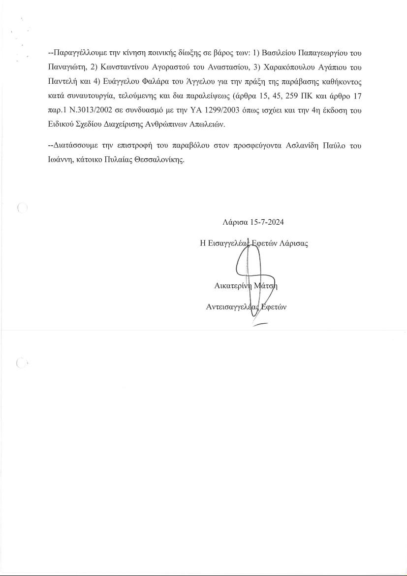 Την παρακάτω διάταξη την έστειλε στην Βουλή η κ. Αικατερίνη Μάτση, Αντεισαγγελέας Εφετών Λάρισας στις 15 Ιουλίου 2024 η οποία 20 μέρες αργότερα, στις 5 Αυγούστου μετατέθηκε, κατόπιν πρότασης του υπουργού Δικαιοσύνη Γιώργου Φλωρίδη, από την Λάρισα, στην Εισαγγελία Εφετών Θεσσαλονίκης.