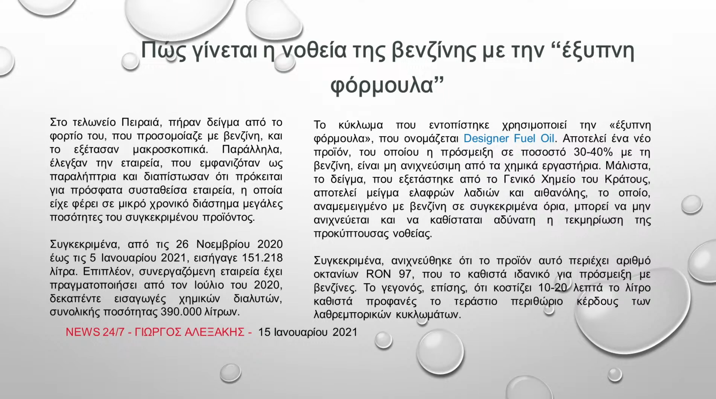 Να συγκαλυψει μηπως τον μαφιοζο που μετεφερε τα παρανομα υλικα? Αυτον που λιγους μηνες μετα το εγκλημα στα τεμπη,εντελως ξαφνικα πουλησε μεγαλη ανωνυμη εταιρεια? Αυτον που εχει την πλειοψηφια των βενζιναδικων στην αθηνα?Πολλα απο τα οποια εχουν φαει λουκετο για νοθευμα καυσιμα? Τοσο απιθανο σου φαινεται?Δεν έχει καμία λογική η όποια προσπάθεια συγκάλυψης παράνομου φορτίου και πόσο μάλλον από κυβερνητικά στελέχη. Τοθς διαλύτες τους μεταφέρει η μαφία και οι μεγάλες ποσότητες, οι @@τες δεξαμενες έρχονται από το λιμάνι χωρίς να χρειάζεται καν κυβερνητική βοήθεια, η ΑΑΔΕ κάνει τέτοια ντου (καρφωτες,) και τις κατασχετει (δεξαμενές), μάλιστα όταν ρωτήθηκαν οι ΑΑΔΕιτες είπαν ότι το θεωρούν απίθανο να μετακινήθηκανε με τρένο, δεν είναι κάτι που περιμενουμε, ούτε και αυτοί από την εμπειρία τους και με την μέχρι τώρα δράση των κυκλωμάτων περίμεναν κάτι τέτοιο. Αντε όμως να ισχυριστούμε πως υπήρχε στο τρένο μικρή ποσότητα, τότε γιατί να κινηθεί ολόκληρος κρατικός μηχανισμός, να συγκαλύψει τι;