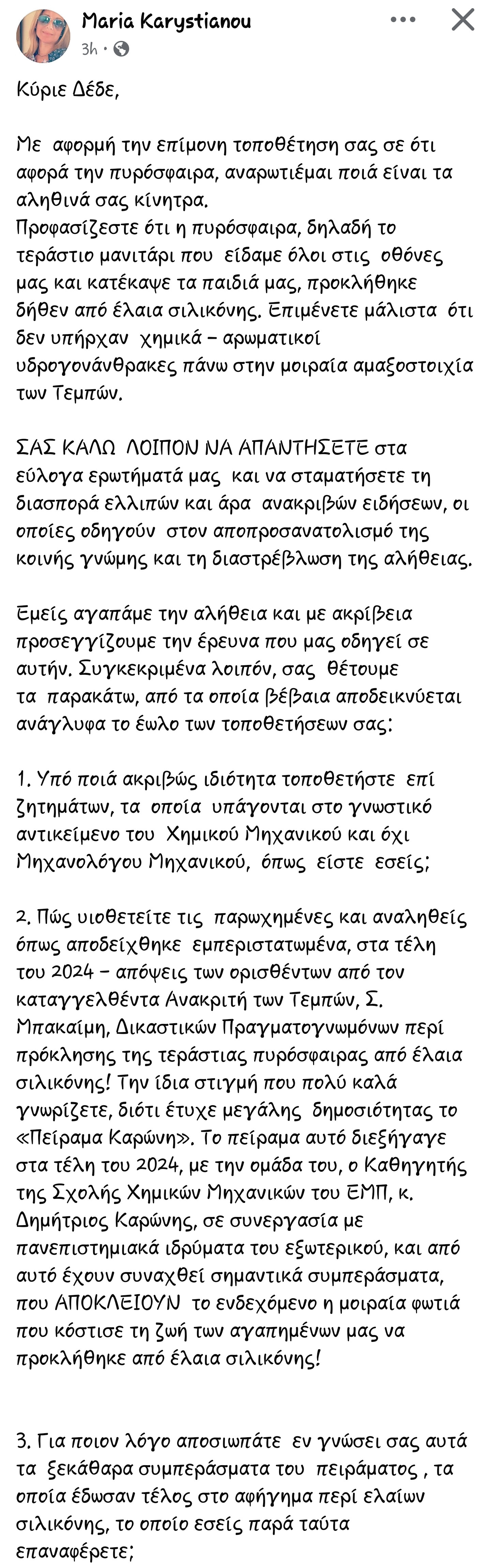2. Πώς υιοθετείτε τις παρωχημένες και αναληθείς όπως αποδείχθηκε εμπεριστατωμένα, στα τέλη του 2024 - απόψεις των ορισθέντων από τον καταγγελθέντα Ανακριτή των Τεμπών, Σ. Μπακαίμη, Δικαστικών Πραγματογνωμόνων περί πρόκλησης της τεράστιας πυρόσφαιρας από έλαια σιλικόνης! Την ίδια στιγμή που πολύ καλά γνωρίζετε, διότι έτυχε μεγάλης δημοσιότητας το «Πείραμα Καρώνη». Το πείραμα αυτό διεξήγαγε στα τέλη του 2024, με την ομάδα του, ο Καθηγητής της Σχολής Χημικών Μηχανικών του ΕΜΠ, κ. Δημήτριος Καρώνης, σε συνεργασία με πανεπιστημιακά ιδρύματα του εξωτερικού, και από αυτό έχουν συναχθεί σημαντικά συμπεράσματα, που ΑΠΟΚΛΕΙΟΥΝ το ενδεχόμενο η μοιραία φωτιά που κόστισε τη ζωή των αγαπημένων μας να προκλήθηκε από έλαια σιλικόνης!