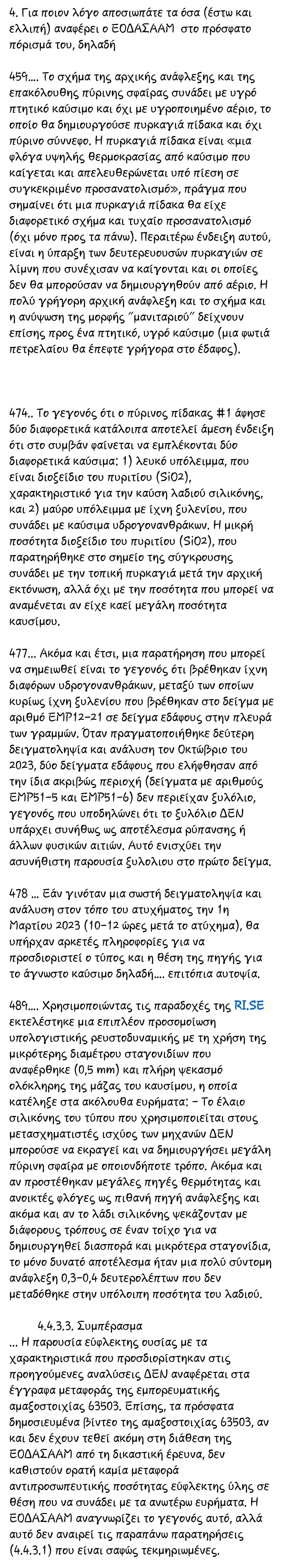 ... Η παρουσία εύφλεκτης ουσίας με τα χαρακτηριστικά που προσδιορίστηκαν στις προηγούμενες αναλύσεις ΔΕΝ αναφέρεται στα έγγραφα μεταφοράς της εμπορευματικής αμαξοστοιχίας 63503. Επίσης, τα πρόσφατα δημοσιευμένα βίντεο της αμαξοστοιχίας 63503, αν και δεν έχουν τεθεί ακόμη στη διάθεση της ΕΟΔΑΣΑΑΜ από τη δικαστική έρευνα, δεν καθιστούν ορατή καμία μεταφορά αντιπροσωπευτικής ποσότητας εύφλεκτης ύλης σε θέση που να συνάδει με τα ανωτέρω ευρήματα. Η ΕΟΔΑΣΑΑΜ αναγνωρίζει το γεγονός αυτό, αλλά αυτό δεν αναιρεί τις παραπάνω παρατηρήσεις (4.4.3.1) που είναι σαφώς τεκμηριωμένες.