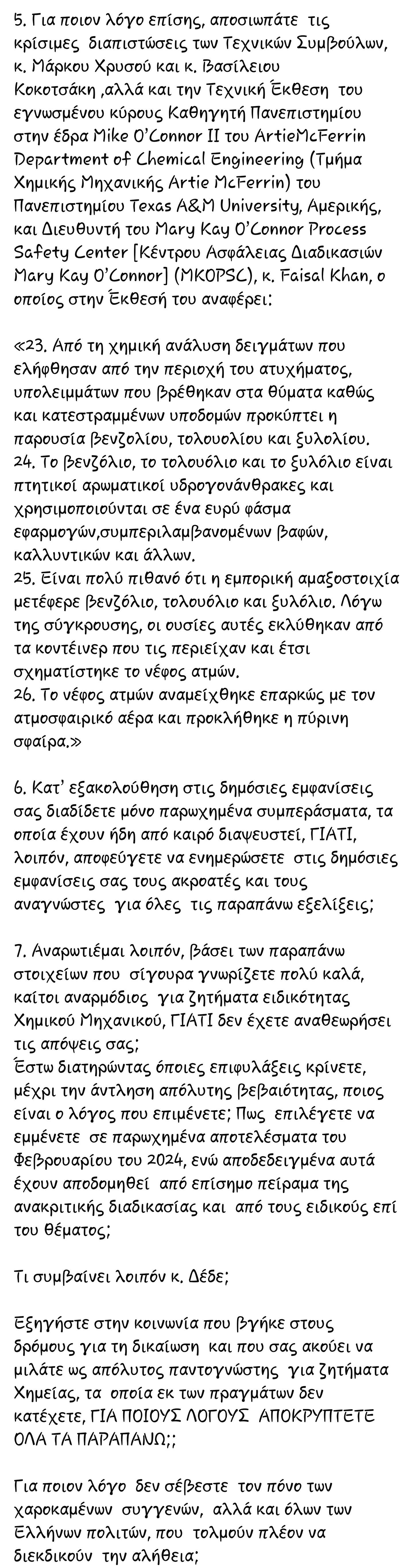 5. Για ποιον λόγο επίσης, αποσιωπάτε τις κρίσιμες διαπιστώσεις των Τεχνικών Συμβούλων, κ. Μάρκου Χρυσού και κ. Βασίλειου Κοκοτσάκη ,αλλά και την Τεχνική Έκθεση του εγνωσμένου κύρους Kαθηγητή Πανεπιστημίου στην έδρα Mike O’Connor II του ArtieMcFerrin Department of Chemical Engineering (Τμήμα Χημικής Μηχανικής Artie McFerrin) του Πανεπιστημίου Texas A&M University, Αμερικής, και Διευθυντή του Mary Kay O’Connor Process Safety Center [Κέντρου Ασφάλειας Διαδικασιών Mary Kay O’Connor] (MKOPSC), κ. Faisal Khan, ο οποίος στην Έκθεσή του αναφέρει: