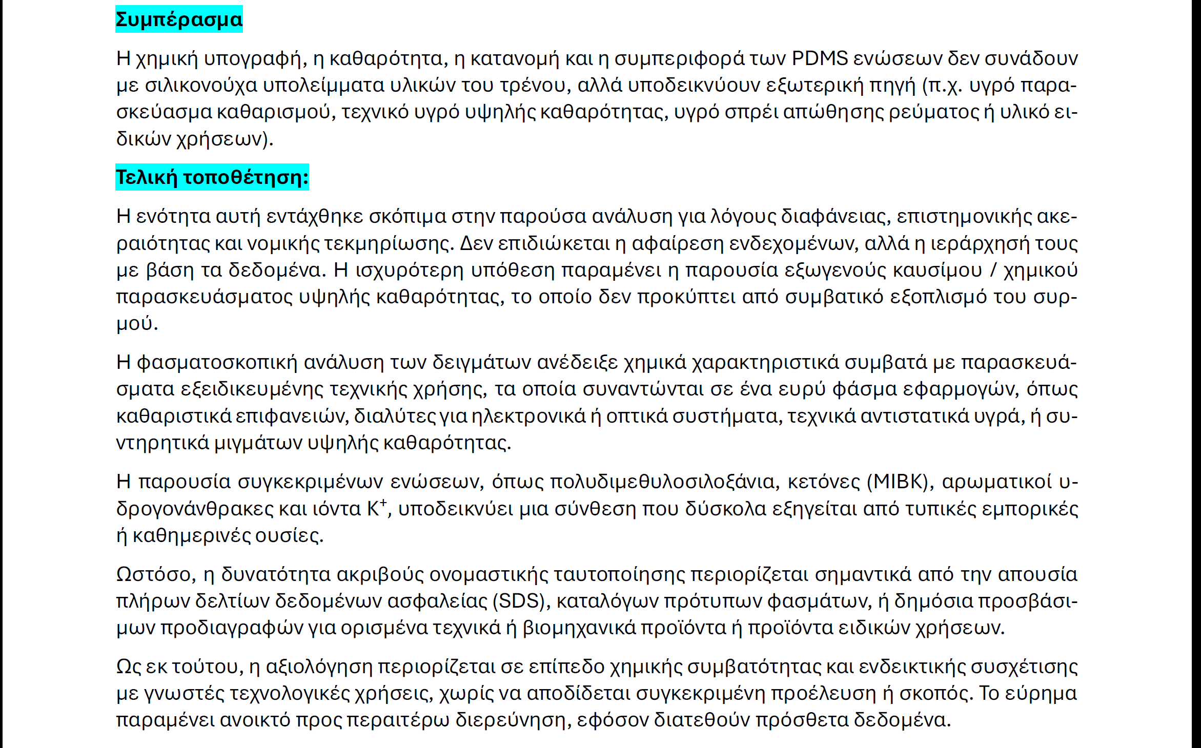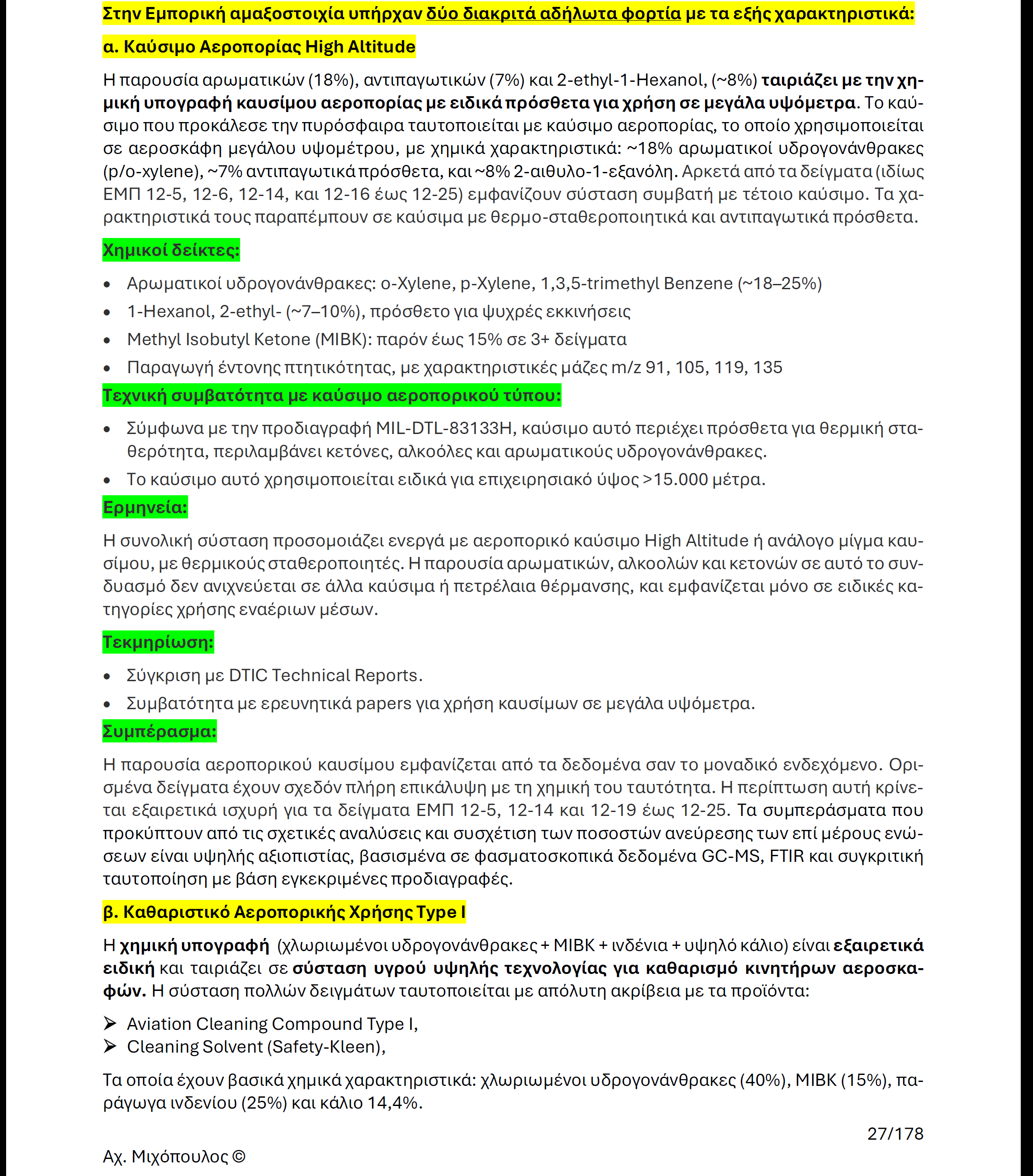 1) το άγνωστο καύσιμο υδρογονανθράκων (13-19 τόνων) που εντοπίστηκε στις χημικές αναλύσεις χαρακτηρίζεται ως αεροπορικού τύπου, δηλαδή έχει τέτοιες ειδικές ιδιότητες εκ κατασκευής ώστε να διατηρείτε σε ρευστή μορφή κατά την πτήση σε μεγάλο υψόμετρο.