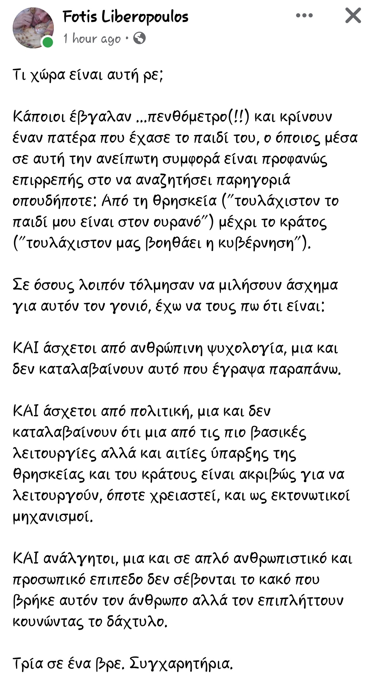 ΝΤΡΟΠΗ σε αυτον τον ''πατερα'' που τολμησε και ξεστομησε αυτην την κουβεντα,επειδη ειναι ΝΔ,μπας και πληγωθει το κομμα.ΝΤΡΟΠΗ για οποιον λογο και να το εκανε.ΝΤΡΟΠΗ ΑΠΛΑ και δεν πρεπει να λεγεται πατερας.