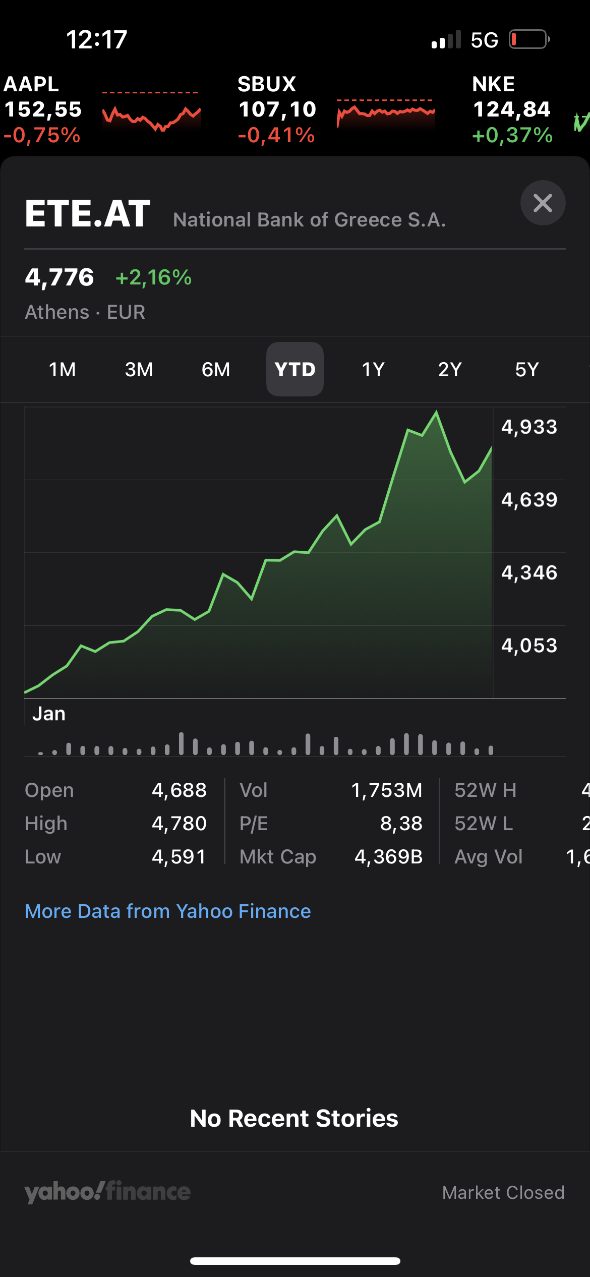 Ναι καμία σχέση με τότε. Το 2007 η Εθνική είχε αξία 27 δισεκατομμύρια ευρώ, ίδια σχεδόν με κολοσσούς όπως η Societe Generale και η Unicredit. Αυτή η αξία προφανώς ήταν πλαστή καθώς η Εθνική δεν είδε ούτε τα ίδια assets ούτε τα ίδια έσοδα και ούτε τα ίδια κέρδη με εκείνους τους γίγαντες. Σήμερα η αξία της Εθνικής (5,7 δις ευρώ) είναι κοντά στην πραγματική της δύναμη καθώς όλες οι Ελληνικές τράπεζες έκαναν σοβαρές μεταρρυθμίσεις την περίοδο των μνημονίων με αποτέλεσμα να γίνουν περισσότερο βιώσιμες και ανταγωνιστικές.Γιατι τώρα η αξία είναι η πραγματική![]()