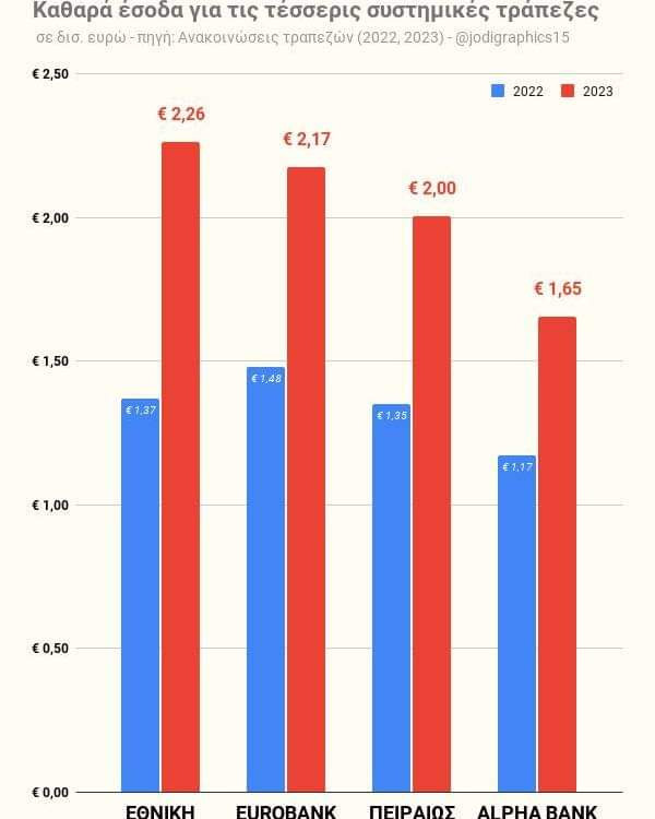 Το χαράτσι του μισου ευρώ ανά λογαριασμό ανά πελάτη το επιβάλει η ecb;Αρχικά το chart είναι λάθος καθώς αυτά δεν είναι τα καθαρά έσοδα αλλά μόνο τα έσοδα από τους τόκους. Πχ τα συνολικά έσοδα της Εθνικής δεν είναι 2.26 δις € αλλά 2.74 δις €. Εκτός από αυτό όμως δεν καταλαβαίνω το point του post καθώς τα επιτόκια τα αυξάνει η ECB και όχι οι Εθνικές κυβερνήσεις. Επίσης, θέλετε αδύναμο τραπεζικό σύστημα το οποίο θα οδηγήσει σε νέο Credit crunch και σε νέο πιθανό bailout program??