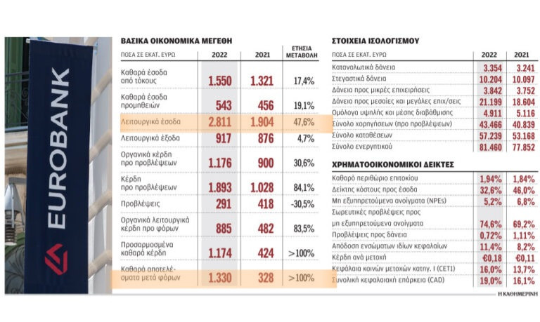 Προς στιγμήν νόμιζα ότι ήταν ζημιές γιατί είδα κόκκινα γράμματα...Τα αποτελέσματα της Eurobank για το 2022. Τα έσοδα εκτιναχθηκαν στα 2,81 δισεκατομμύρια ευρώ και τα καθαρά κέρδη τετραπλασιαστηκαν στα 1,33 δισεκατομμύρια ευρώ.