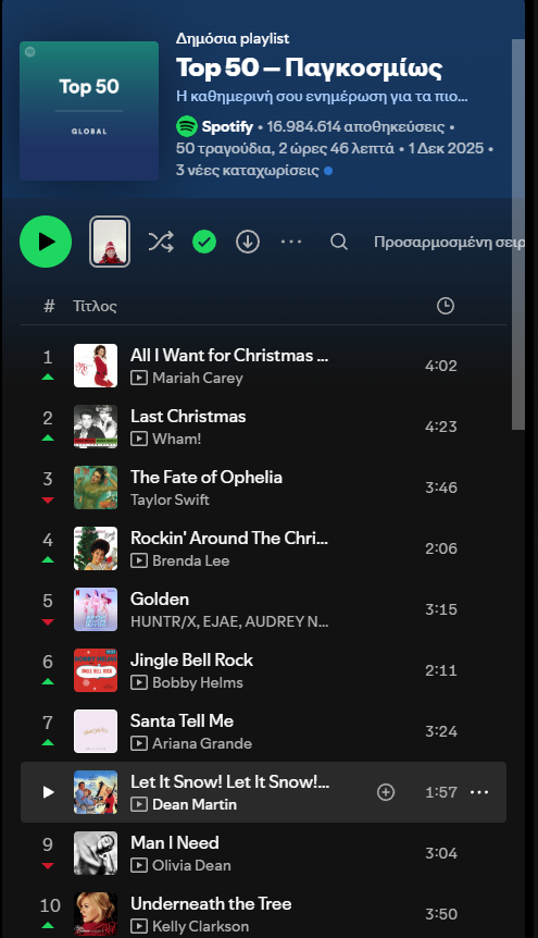 Εικόνα από το Spotify μου:Το All I want for Christmas is you είναι επίσημα στην κορυφή του πλανήτη. Το τραγούδι κατέγραψε σχεδόν 6.7 εκατομμύρια streams τη χθεσινή ημέρα, εκθρονίζοντας την Taylor Swift (The Fate of Ophelia) μετά από 57 συνεχόμενες ημέρες στην κορφή.