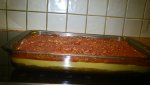 Στρώνετε το μίγμα στο ταψάκι και το βάζετε στον φούρνο για 1 ώρα (στους 160).