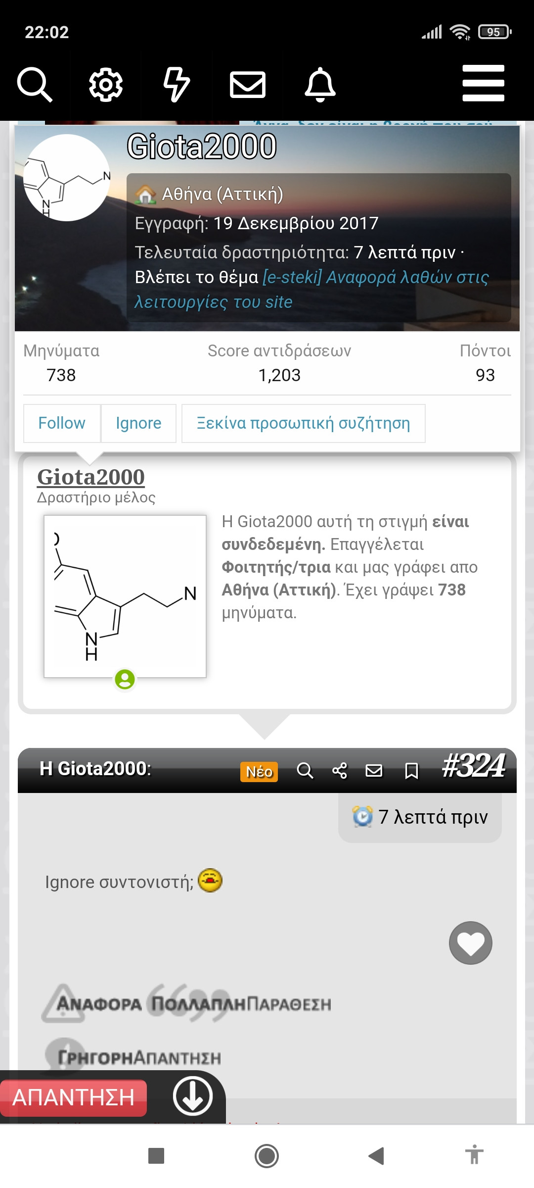 Η Chem2000 αυτή τη στιγμή δεν είναι συνδεδεμένη. Είναι 25 ετών, επαγγέλλεται Μεταπτυχιακός Φοιτητής/τρια και μας γράφει από Νίκαια (Αττική). Έχει γράψει 3.241 μηνύματα.
