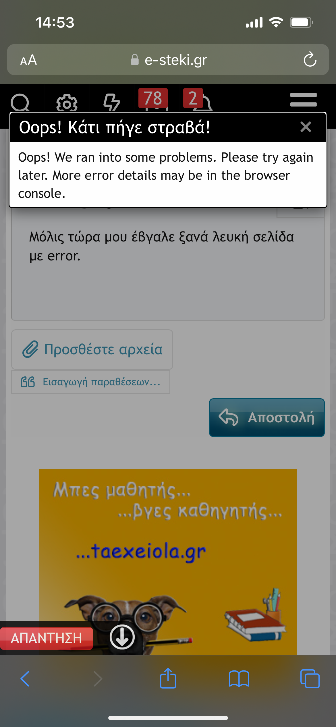 Μόλις τώρα μου έβγαλε ξανά λευκή σελίδα με error. Από το iPhone δεν μπορώ να μπω καν.