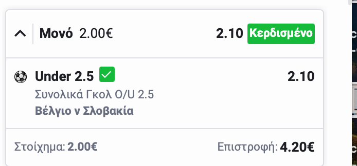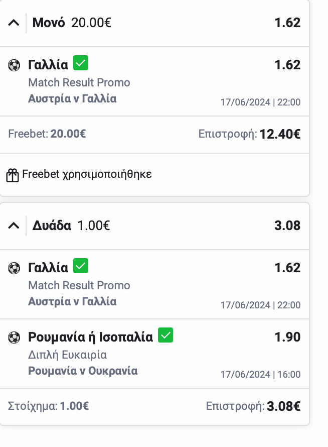 Καλή στοιχηματικά μέρα. Πρόβλεψα ότι η Ρουμανία θα καταφέρει τουλάχιστον το Χ, ότι ο Λουκάκου θα χάνει το γκολ το ένα μετά το άλλο και τη νίκη της Γαλλία. Η νίκη της Γαλλίας ήταν σημαντική γιατί σε αυτό επένδυσα το freebet των 20 ευρώ. 1.62 απόδοση δεν ήταν κακή.