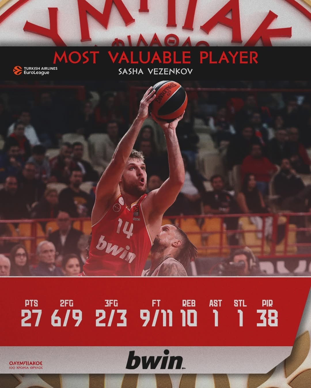Ο Σάσα Βεζένκοβ έγραψε 38 PIR στη νίκη του Ολυμπιακού επί της Βίρτους και προσπέρασε στο νήμα τον Κέντρικ Ναν, που είχε 37 PIR στην επικράτηση του Παναθηναϊκού απέναντι στην Αρμάνι.