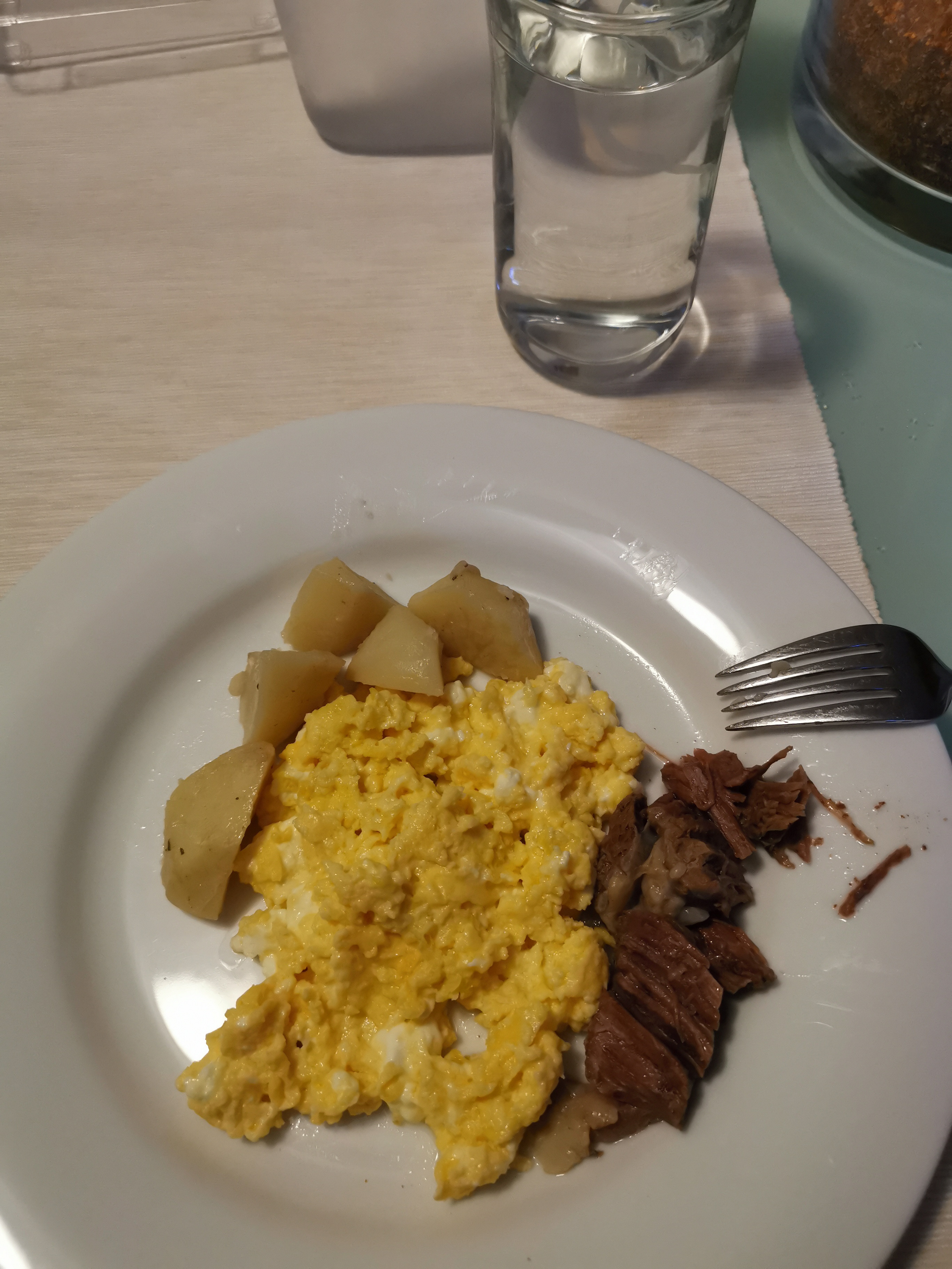 (ομελέτα με 2 αυγά, ελαιόλαδο και φέτα μαζί με λίγο βραστό μοσχάρι και βραστές πατάτες)